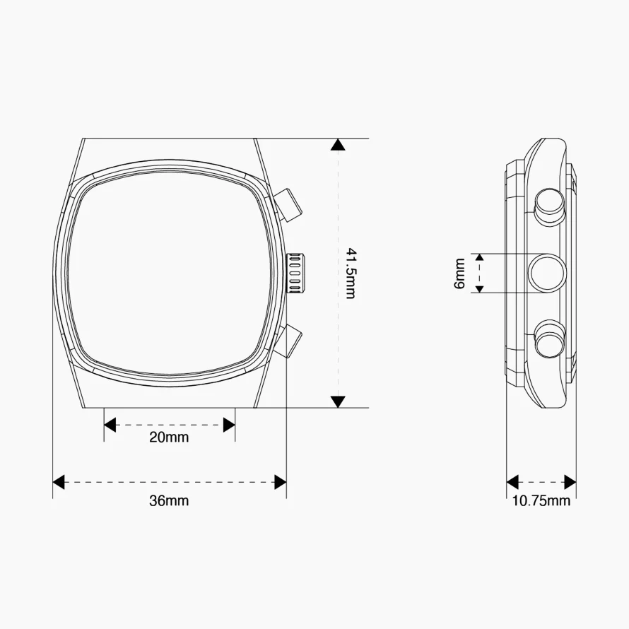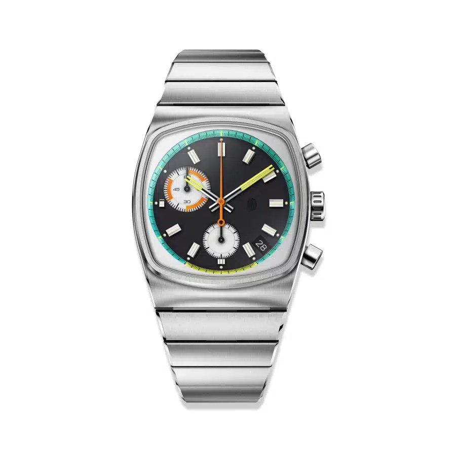 The Brew Watch Co. Metric Retro Dial offers an engaging blend of vintage aesthetics and modern precision. Immediately noticeable is the square 36mm case with its distinctly retro-inspired profile, reminiscent of the iconic integrated bracelet designs of the 1970s. The matte black dial contrasts sharply against vibrant accents, making the dial easily readable and visually appealing. The dial creatively integrates coffee-inspired elements, including espresso-timing markers and subtle thematic nods.